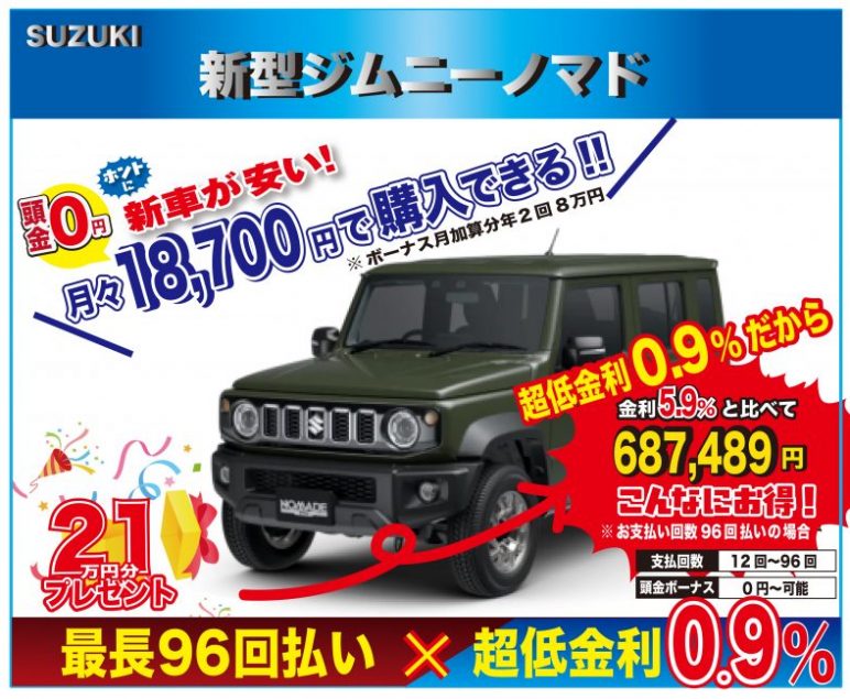 新車新型ジムニ―ノマドをオートローンで購入なら小川オート!!固定金利0.9%・最長96回払いに対応。小川オートの大人気オプション・業界最高峰のセラミックコーティング(5年保証)165,000円分・フロントガラス撥水 コーティング22,000円分・室内光触媒ルームコーティング23,000円分!総額210,000円分をプレゼント。 ※ボディーカラーやメーカーオプション(別料金)はご自由にお選びいただけます。