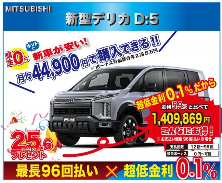 - 金利0.1%!来店不要でスムーズ購入!小川オートだけの台数限定販売!!初売り!!【限定5台】ミツビシ 新車 新型デリカD5! 国内最安値に挑戦中!!